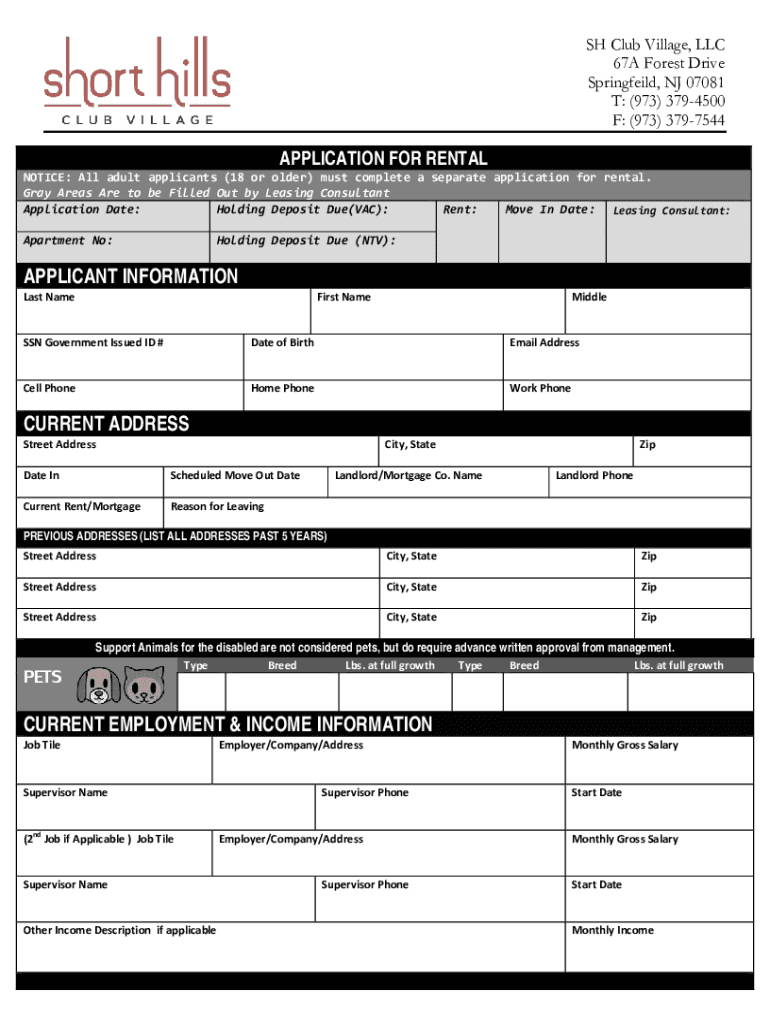 SH Club Village, LLC 67A Forest Drive Springfeild, NJ 07081 T: (973) 3794500 F: (973) 3797544APPLICATION FOR RENTALNOTICE: All adult applicants (18 or older) must complete a separate application for