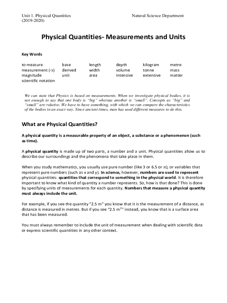 Unit 1. Physical Quantities (20192020)Natural Science DepartmentPhysical Quantities Measurements and Units Keywords to measure measurement (s) magnitude scientific notation base derived unit length