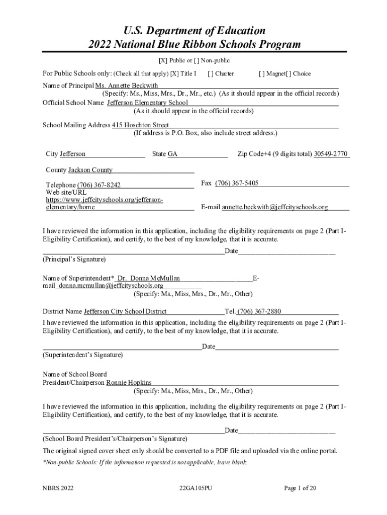 U.S. Department of Education 2022 National Blue Ribbon Schools Program [X] Public or [ ] Nonpublic Public Schools only: (Check all that apply) [X] Title I[ ] Charter[ ] Magnet[ ] ChoiceName of Principal
