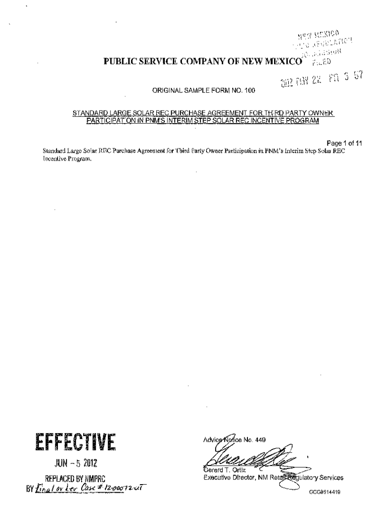 cPUBLIC SERVICE COMPANY OF NEW MEXICO \" \') .1 1\'1 \' . I,i)ORIGINAL SAMPLE FORM NO. 100STANDARD LARGE SOLAR REC PURCHASE AGREEMENT FOR THIRD PARTY OWNER PARTICIPATION IN PNM\'S INTERIM STEP SOLAR