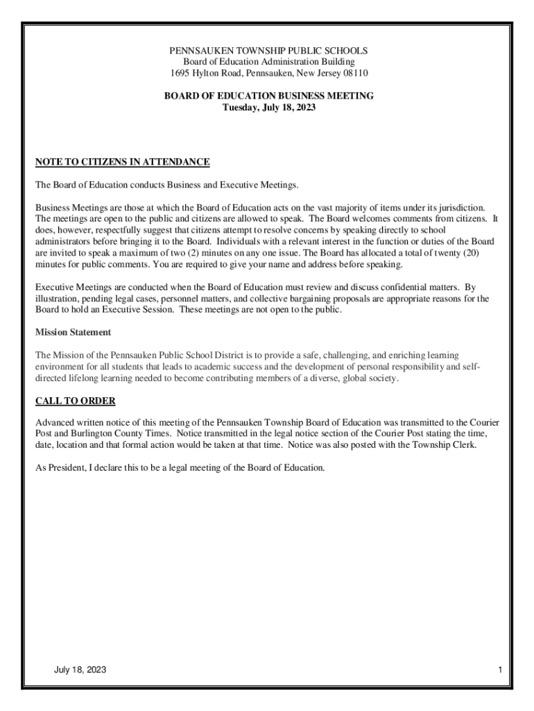 PENNSAUKEN TOWNSHIP PUBLIC SCHOOLS Board of Education Administration Building 1695 Hilton Road, Pennsauken, New Jersey 08110 BOARD OF EDUCATION BUSINESS MEETING Tuesday, July 18, 2023NOTE TO CITIZENS