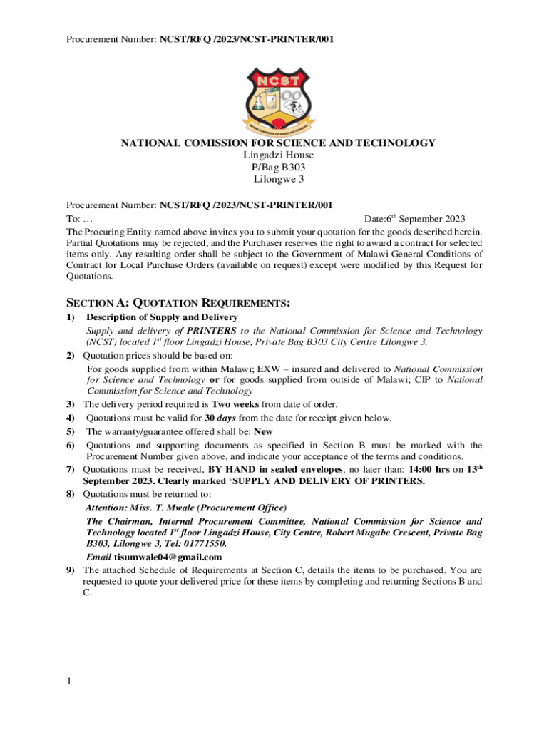 Procurement Number: NCST/RFQ /2023/NCSTPRINTER/001NATIONAL COMISSION FOR SCIENCE AND TECHNOLOGY Lingadzi House P/Bag B303 Lilongwe 3 Procurement Number: NCST/RFQ /2023/NCSTPRINTER/001 To: Date:6th