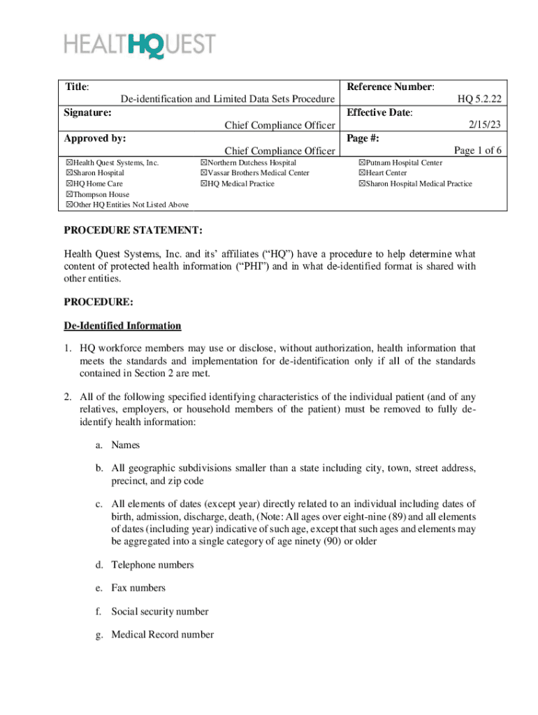 DocuSign Envelope ID: 25828C84BEA047E986F54616B8207CE7Title:Reference Number: Deidentification and Limited Data Sets ProcedureSignature:HQ 5.2.22 Effective Date:Chief Compliance Officer Approved by:Page