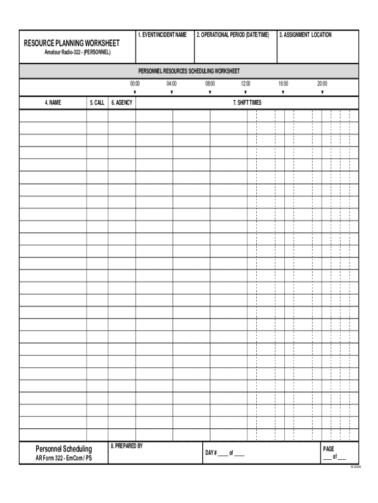 1. EVENT/INCIDENT NAME2. OPERATIONAL PERIOD (DATE/TIME)3. ASSIGNMENT LOCATIONRESOURCE PLANNING WORKSHEET Amateur Radio322 (PERSONNEL) PERSONNEL RESOURCES SCHEDULING WORKSHEET 00:00 4. NAME5. CALLPersonnel