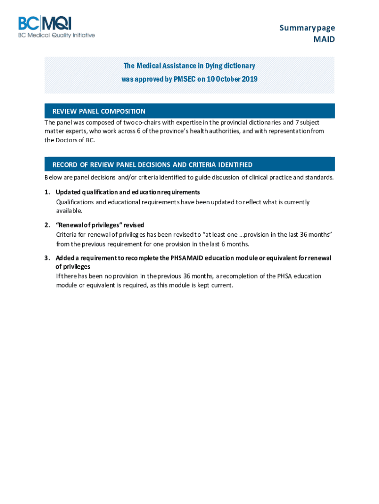 Summary page MAID The Medical Assistance in Dying dictionary was approved by PM SEC on 10 October 2019REVIEW PANEL COMPOSITION The panel was composed of two coheres with expertise in the provincial