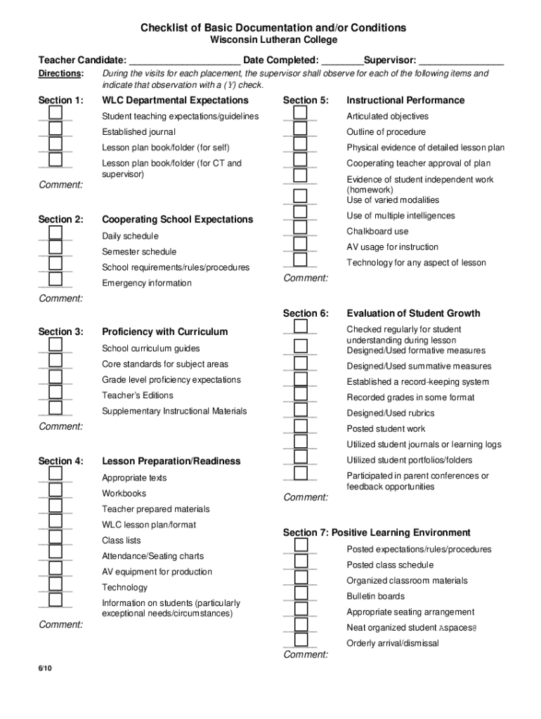 Checklist of Basic Documentation and/or Conditions Wisconsin Lutheran College Teacher Candidate: ___ Date Completed: ___Supervisor: ___ Directions:During the visits for each placement, the supervisor