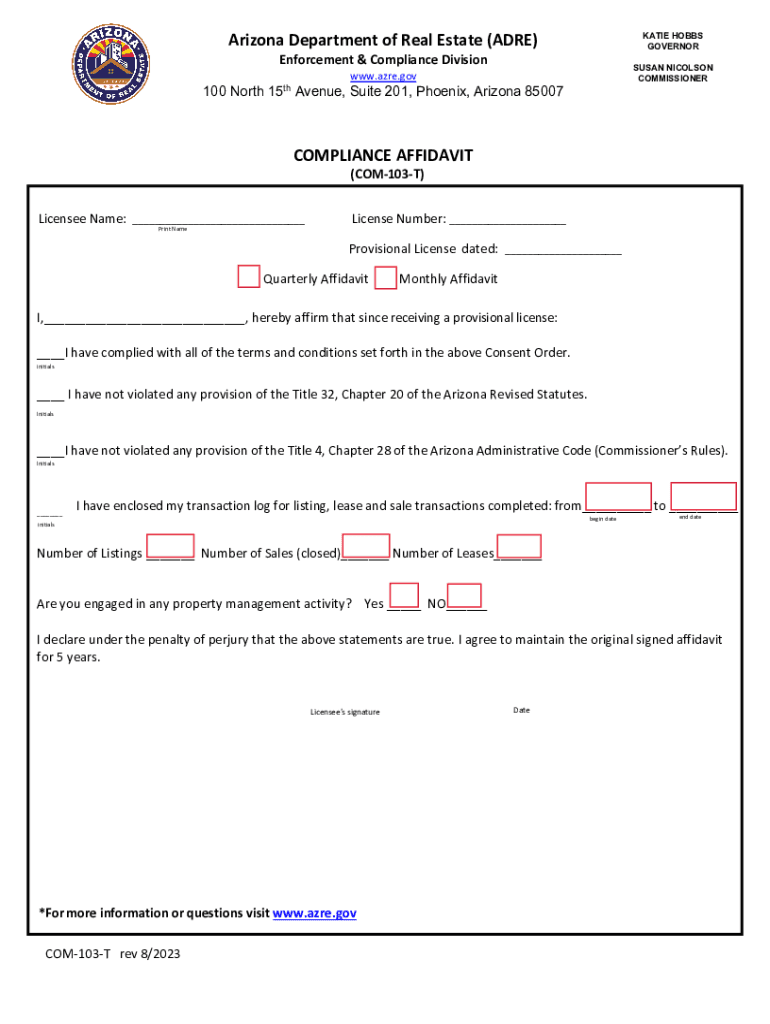 COMMISSIONEREnforcement & Compliance Division100 North 15th Avenue, Suite 201, Phoenix, Arizona 85007COMPLIANCE AFFIDAVIT