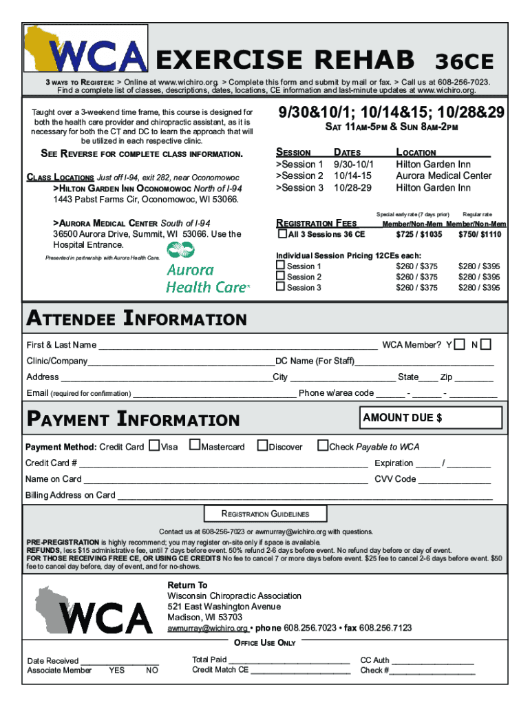 EXERCISE REHAB 36CE 3Register: Online at www.wichiro.org. Complete this form and submit by mail or fax. Call us at 6082567023. Find a complete list of classes, descriptions, dates, locations, CE information