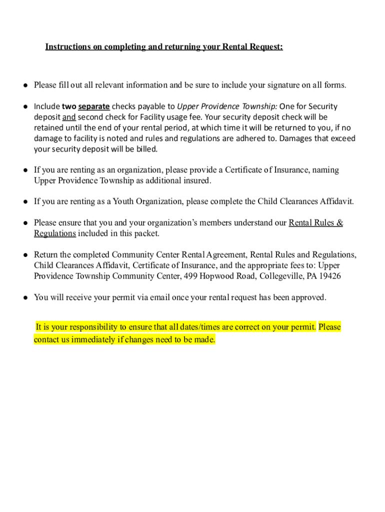 Instructions on completing and returning your Rental Request: Please fill out all relevant information and be sure to include your signature on all forms. Include two separate checks payable to Upper