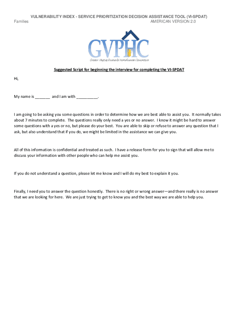 Get the free Suggested Script for beginning the interview for completing the VI-SPDAT