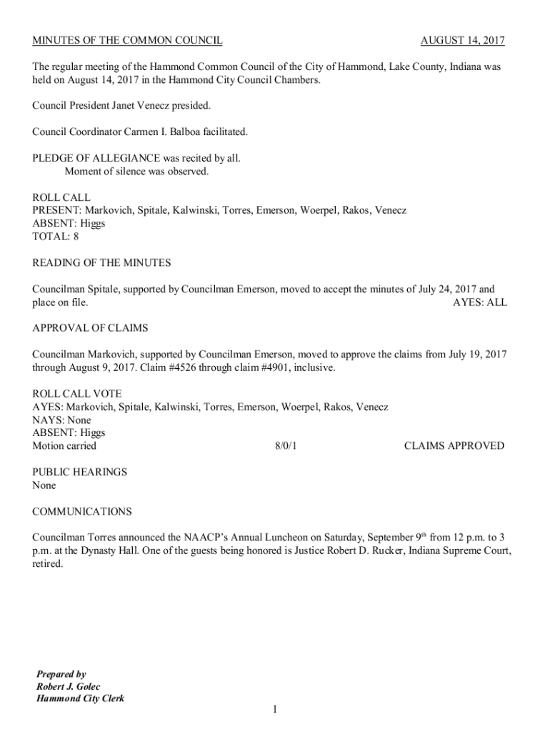 MINUTES OF THE COMMON COUNCILAUGUST 14, 2017The regular meeting of the Hammond Common Council of the City of Hammond, Lake County, Indiana was held on August 14, 2017, in the Hammond City Council