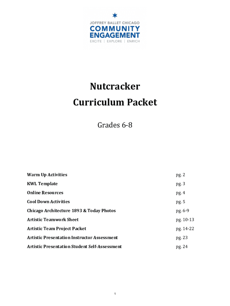 Nutcracker Curriculum Packet Grades 68Warm Up Activitiespg. 2KWL Templatepg. 3Online Resourcespg. 4Cool Down Activitiespg. 5Chicago Architecture 1893 & Today Photospg. 69Artistic Teamwork Sheetpg.