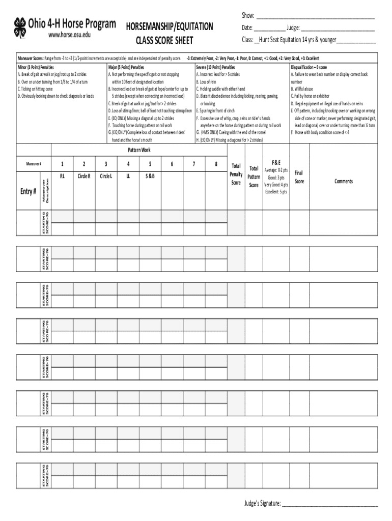 Show: ___ Date: ___ Judge: ___ Class: __Hunt Seat Equitation 14 yrs & younger___HORSEMANSHIP/EQUITATION CLASS Scoresheet Maneuver Scores: Range from 3 to +3 (1/2point increments are acceptable) and