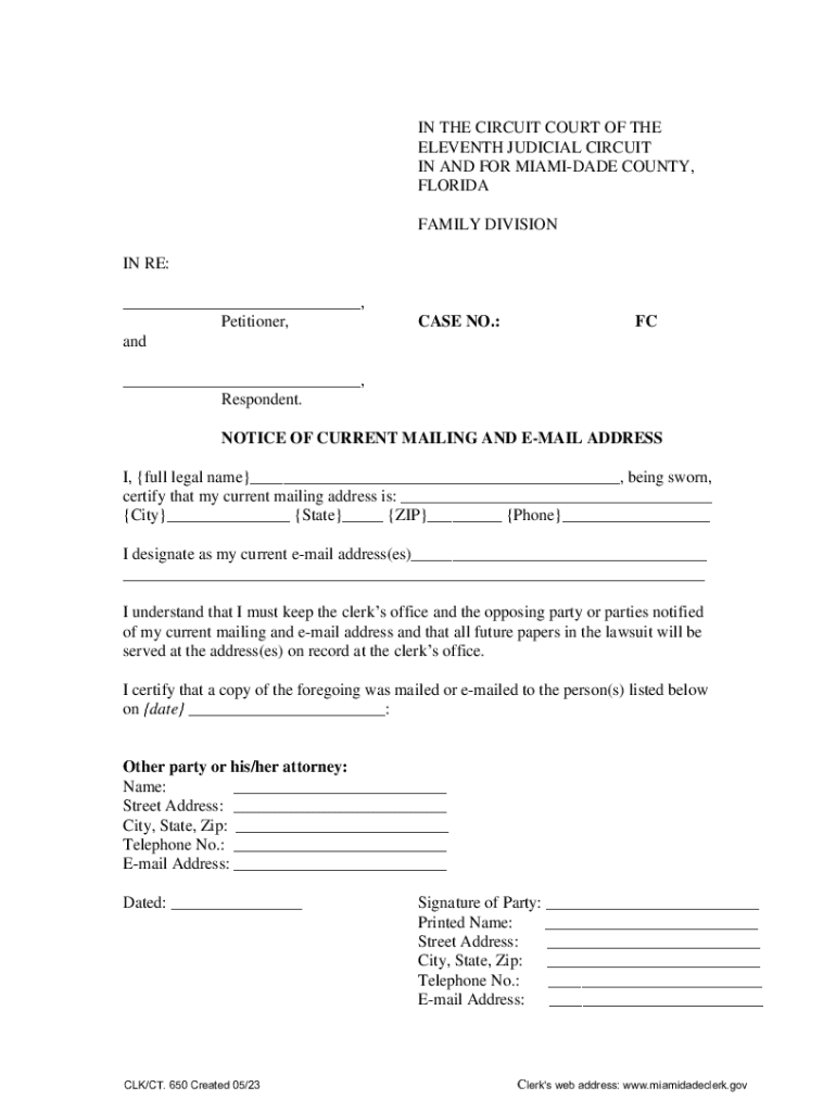 IN THE CIRCUIT COURT OF THE ELEVENTH JUDICIAL CIRCUIT IN AND FOR MIA MIDADE COUNTY, FLORIDA FAMILY DIVISION IN RE: ___, Petitioner, and CASE NO.:FC___, Respondent. NOTICE OF CURRENT MAILING AND EMAIL