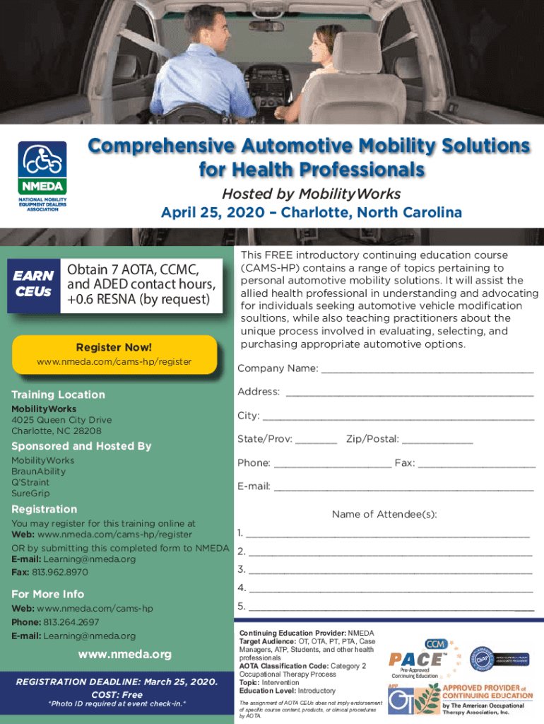 Comprehensive Automotive Mobility Solutions for Health Professionals Hosted by MobilityWorks April 25, 2020 Charlotte, North CarolinaEARN CEUsObtain 7 AOTA, CCMC, and ADED contact hours, +0.6 RESNA
