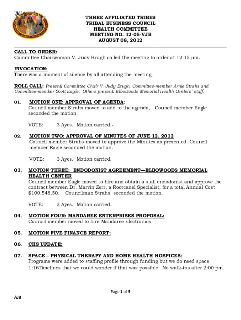 THREE AFFILIATED TRIBES TRIBAL BUSINESS COUNCIL HEALTH COMMITTEE MEETING NO. 1205VJB AUGUST 08, 2012, CALL TO ORDER: Committee Chairwoman V. Judy Brush called the meeting to order at 12:15 pm. INVOCATION: