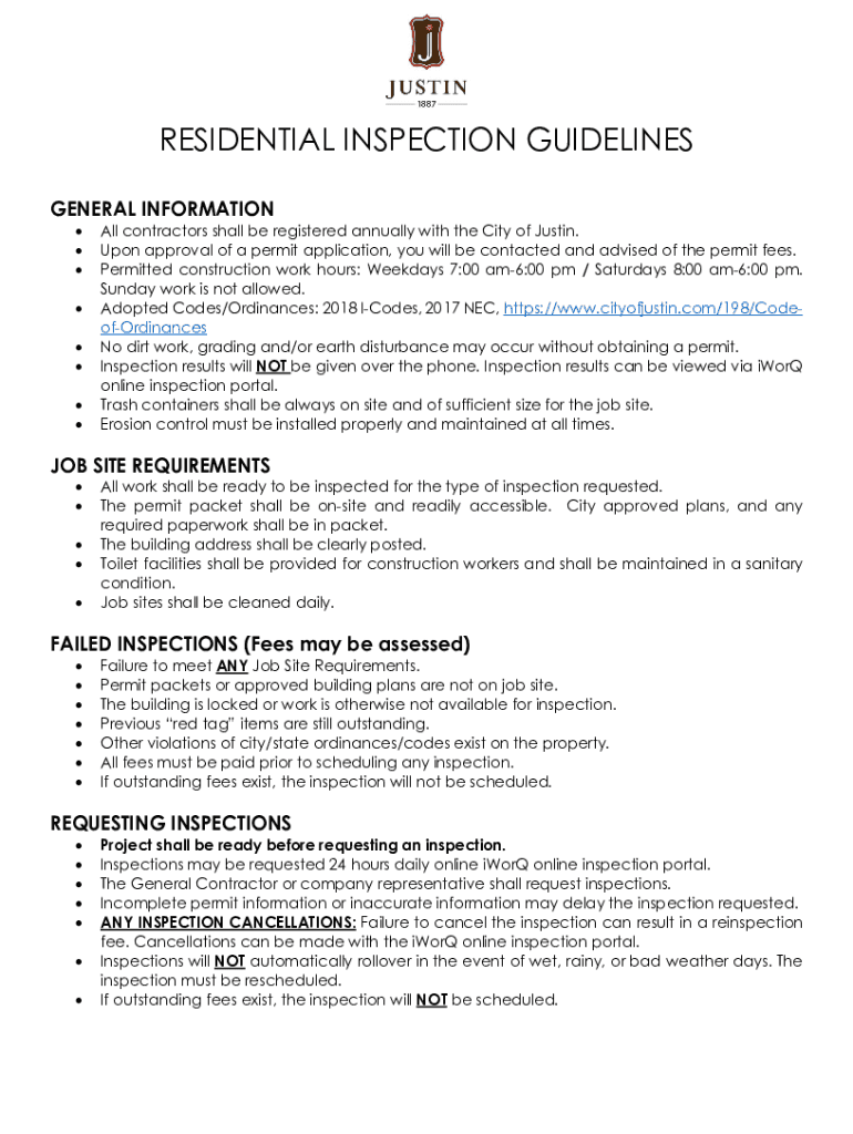 RESIDENTIAL INSPECTION GUIDELINES GENERAL INFORMATION All contractors shall be registered annually with the City of Justin. Upon approval of a permit application, you will be contacted and advised