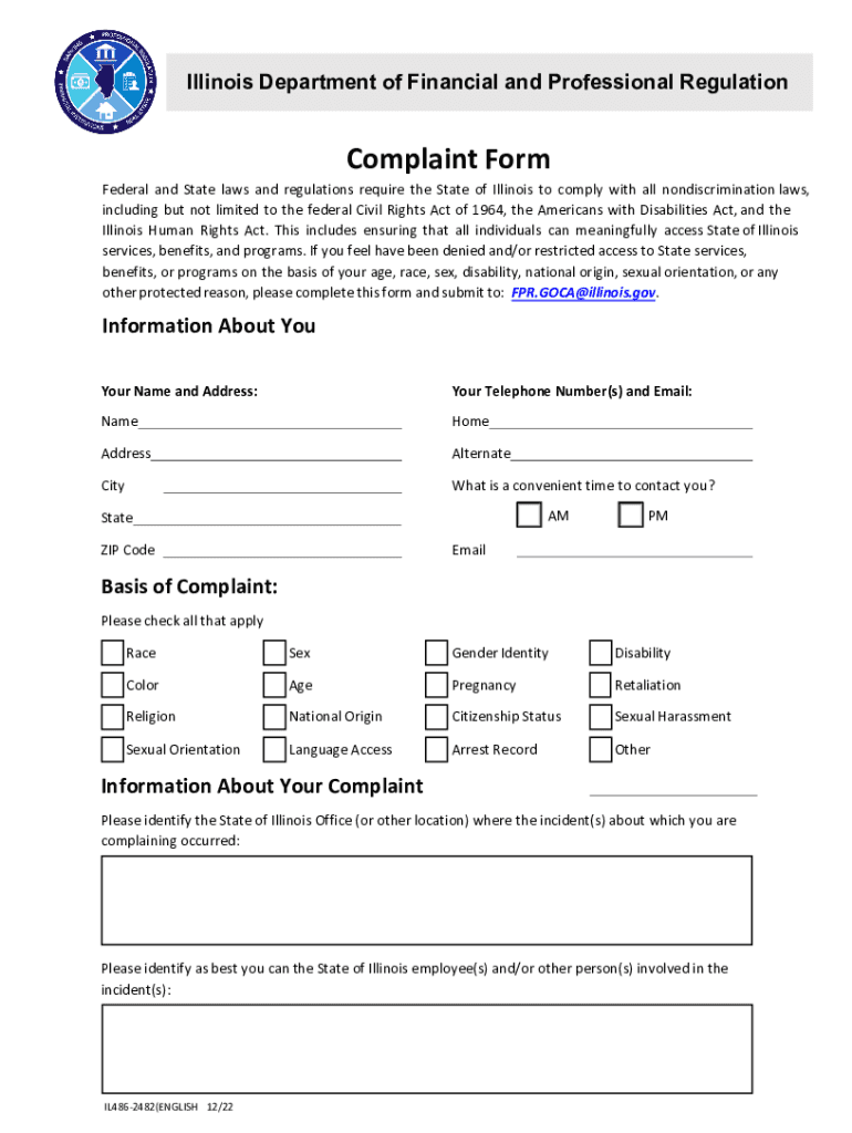 Illinois Department of Financial and Professional RegulationComplaint FormFederalandStatelawsandregulationsrequiretheStateofIllinoistocomplywithallnondiscrimination laws, includingbut not limitedtothefederal