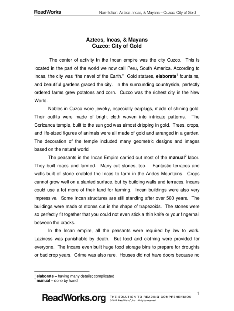 Nonfiction: Aztecs, Incas, & Mayans Cuzco: City of GoldAztecs, Incas, & Mayans Cuzco: City of Gold The center of activity in the Incan empire was the city Cuzco. This is located in the part of the