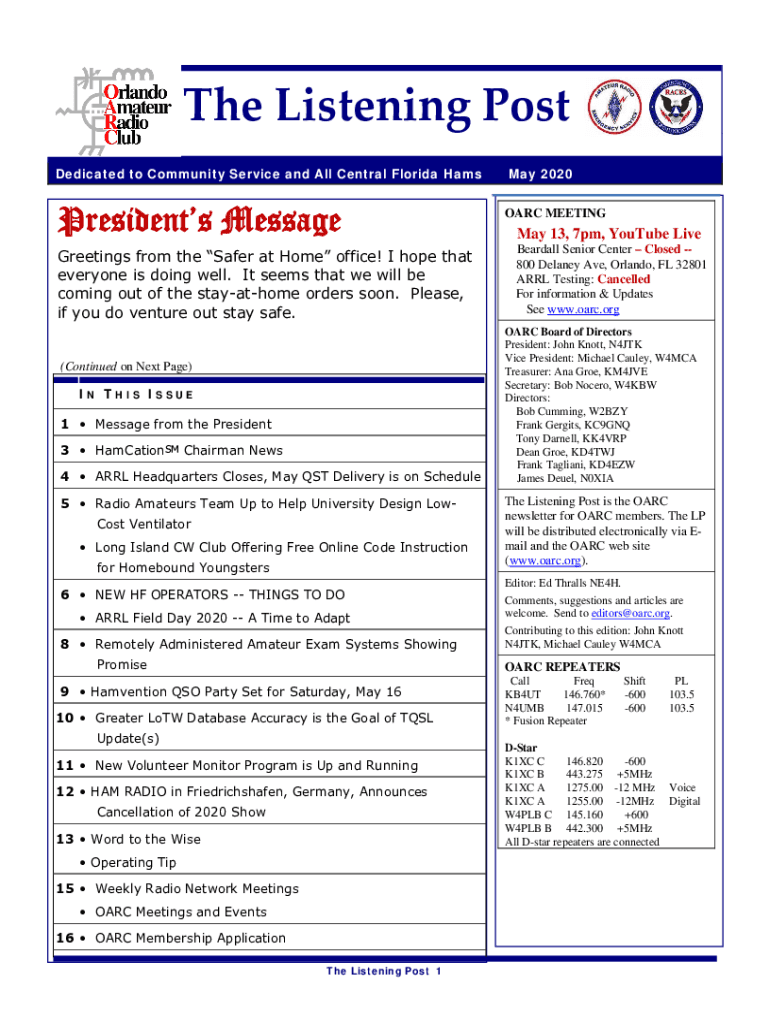 TheListeningPost Dedicated to Community Service and All Central Florida Hams May 2020Presidents MessageOARC MEETINGGreetings from the Safer at Home office! I hope that everyone is doing well. It seems