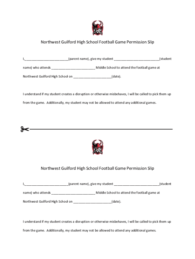 Northwest Guilford High School Football Game Permission Slip, ___(parent name), give my student ___(student name) who attends ___ Middle School to attend the football game at Northwest Guilford High