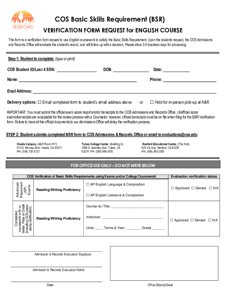 COS Basic Skills Requirement (BSR) VERIFICATION FORM REQUEST for ENGLISH COURSE This form is a verification form request to use English coursework to satisfy the Basic Skills Requirement. Upon the