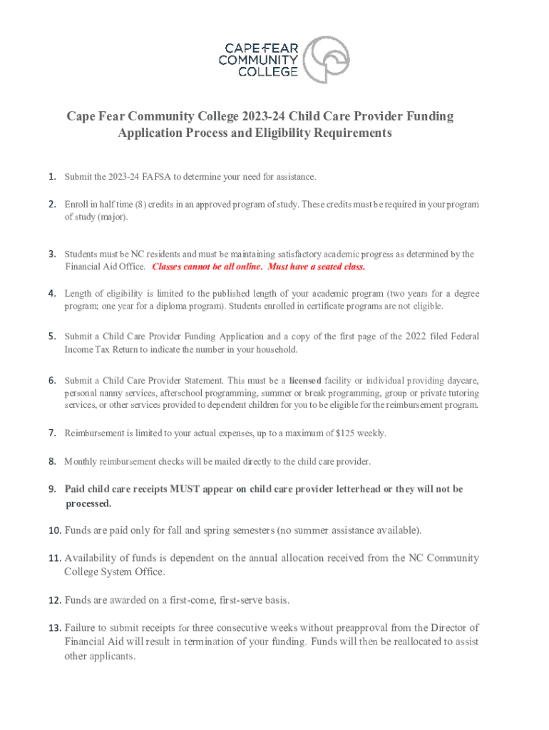 Cape Fear Community College 202324 Child Care Provider Funding Application Process and Eligibility Requirements 1. Submit the 202324 FAFSA to determine your need for assistance. 2. Enroll in half-time