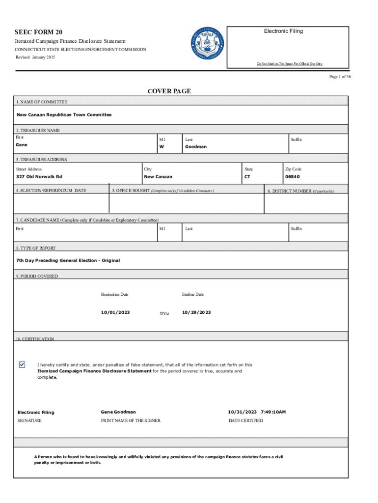 Electronic FilingS EEC FORM 20 Itemized Campaign Finance Disclosure Statement CONNECTICUT STATE ELECTIONS ENFORCEMENT COMMISSION Revised January 2015Do Not Mark in This Space For Official Use Only