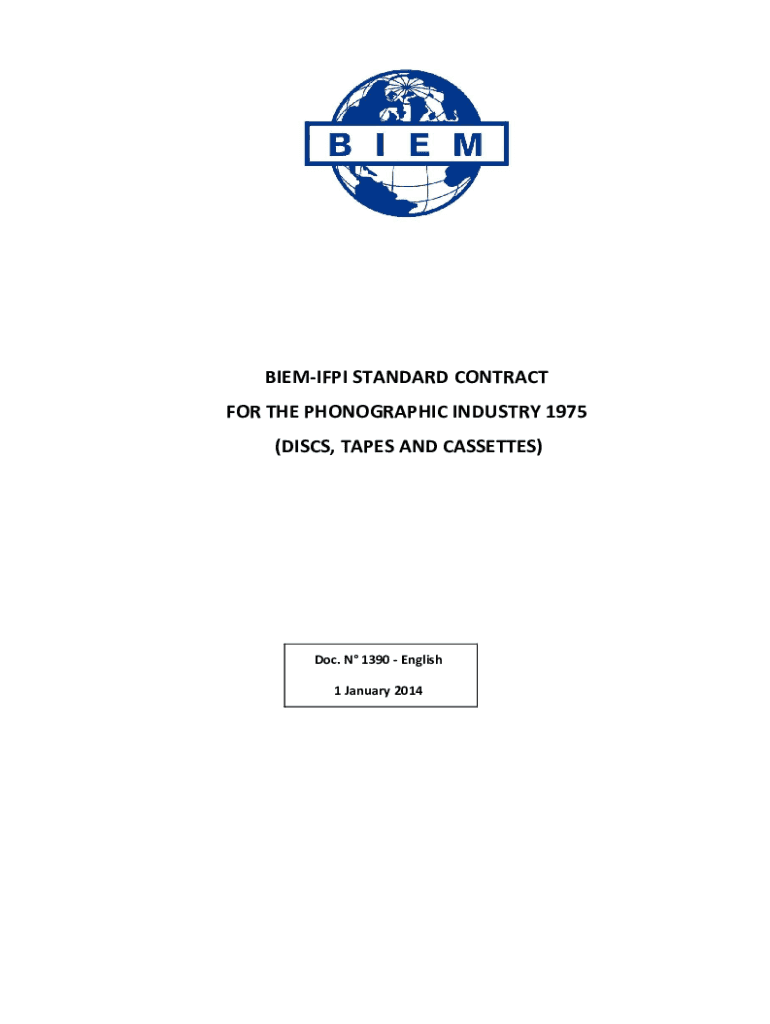BIMINI STANDARD CONTRACT FOR THE PHONOGRAPHIC INDUSTRY 1975 (DISCS, TAPES AND CASSETTES)Doc. N 1390 English 1 January 2014The text hereafter includes the following amendments:Amendment No. 1signed