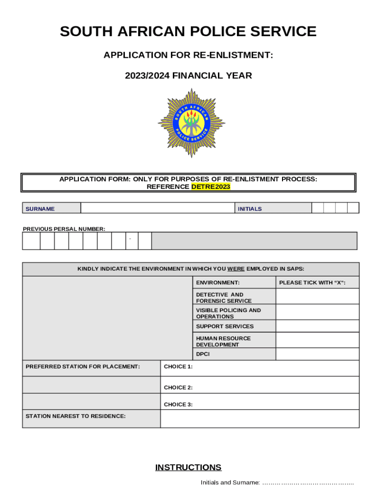 The south african police service application for re-enlistment is a Word document that can be completed and signed for certain purpose. Next, it is provided to the exact addressee to provide specific details of certain kinds. The completion and signing is able in hard copy or using a suitable tool like PDFfiller. Such services help to complete any PDF or Word file online. While doing that, you can customize it depending on the needs you have and put a legal digital signature. Upon finishing, you send the south african police service application for re-enlistment to the respective recipient or several recipients by email and also fax. PDFfiller is known for a feature and options that make your template printable. It offers a variety of options when printing out appearance. No matter, how you distribute a form - in hard copy or electronically - it will always look neat and clear. To not to create a new editable template from the beginning every time, turn the original form into a template. After that, you will have an editable sample.