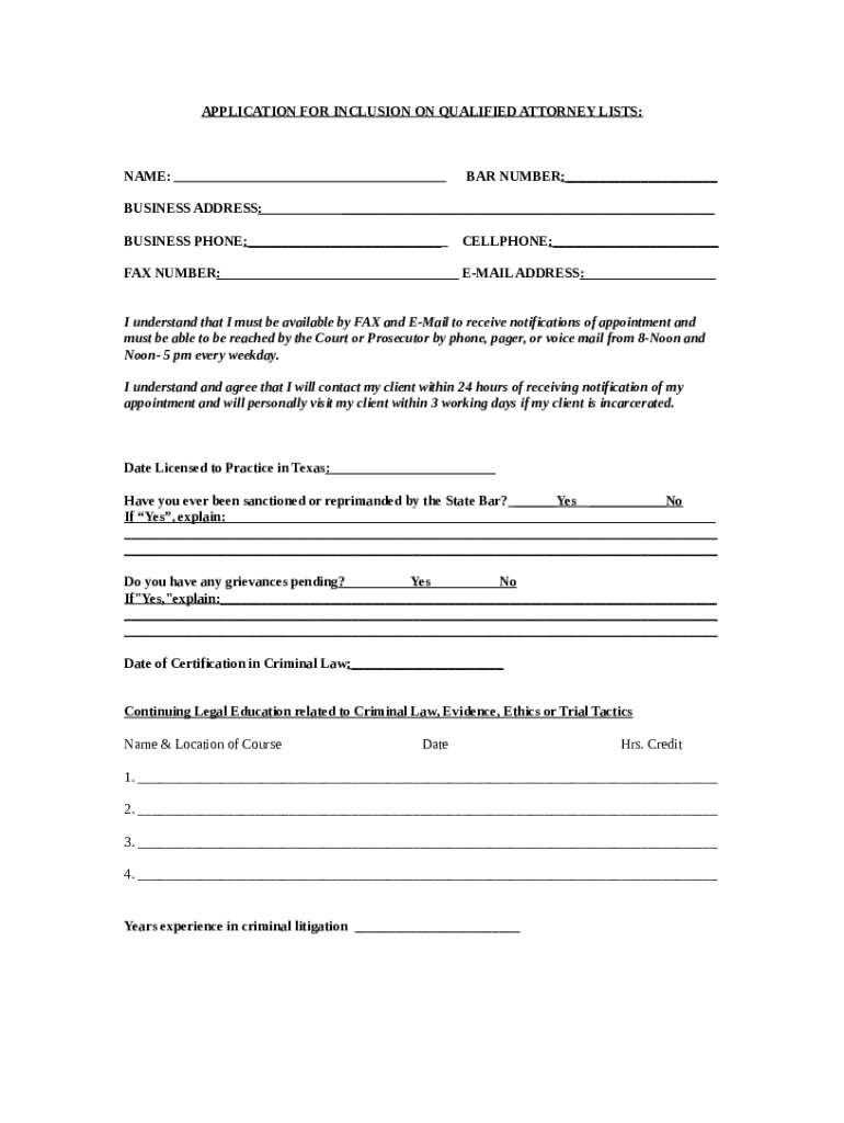 Template APPLICATION FOR INCLUSION ON QUALIFIED ATTORNEY LISTS instructions