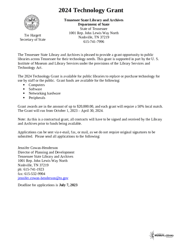 Instructions for the Grants for Public LibrariesTennessee Secretary of State form