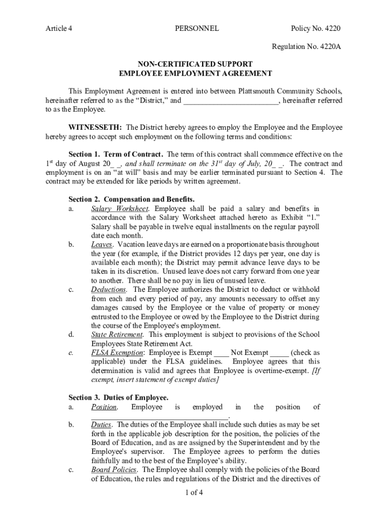 Article 4PERSONNELPolicy No. 4220 Regulation No. 4220ANONCERTIFICATED SUPPORT EMPLOYEE EMPLOYMENT AGREEMENT This Employment Agreement is entered into between Plattsmouth Community Schools, hereinafter