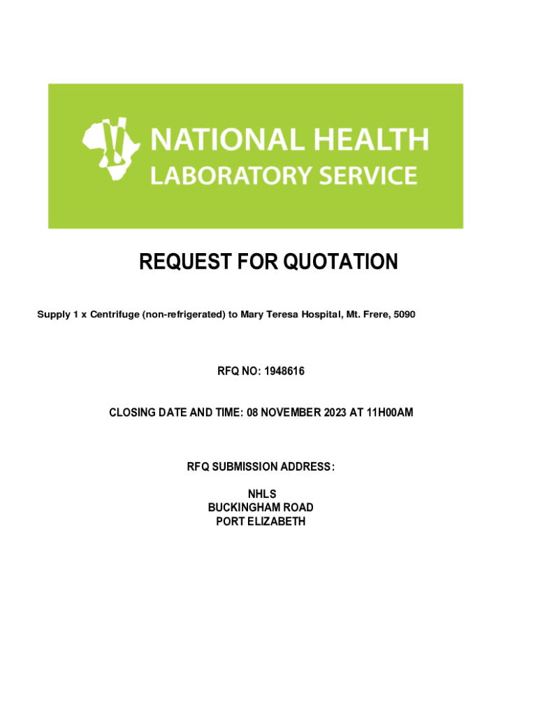 REQUEST FOR QUOTATION Supply 1 x Centrifuge (nonrefrigerated) to Mary Teresa Hospital, Mt. Frier, 5090RFQ NO: 1948616 CLOSING DATE AND TIME: 08 NOVEMBER 2023 AT 11H00AMRFQ SUBMISSION ADDRESS: NHS