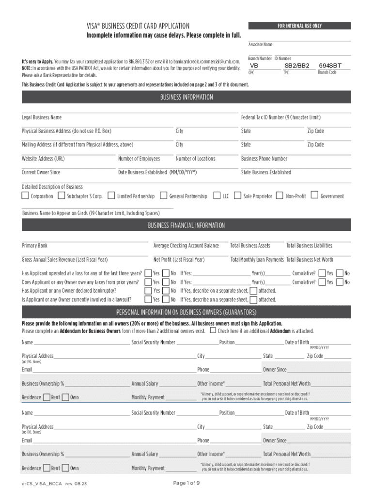 VISA BUSINESS CREDIT CARD APPLICATIONFOR INTERNAL USE ONLYIncomplete information may cause delays. Please complete in full. Associate NameIts easy to Apply. You may fax your completed application