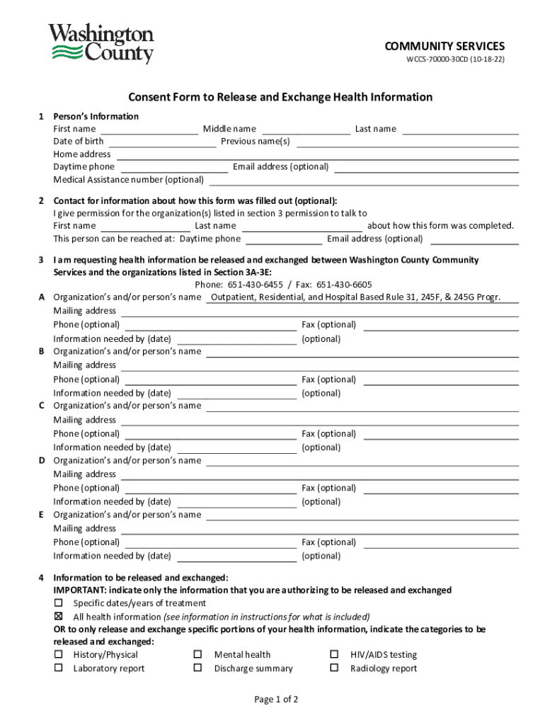 COMMUNITY SERVICES WCCS7000030CD (101822)Consent Form to Release and Exchange Health Information 1 Persons Information First name Middle name Date of birth Previous name(s) Home address Daytime phone