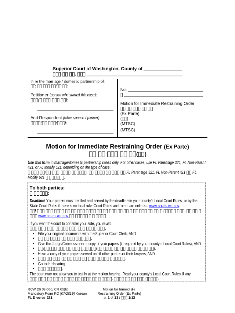The Washington restraining order form is a legal document designed to protect individuals from harm, particularly in situations involving domestic violence. This form allows petitioners to seek immediate legal protection from an abuser or threat, ensuring their safety. It is essential for those facing serious situations, such as threats or acts of violence, enabling them to secure a protective order without delay.