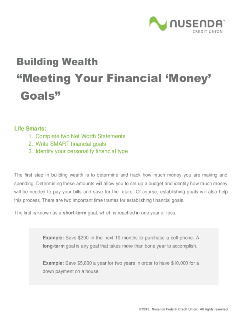 Building WealthMeeting Your Financial Money Goals Life Smarts: 1. Complete two Net Worth Statements 2. Write SMART financial goals 3. Identify your personality financial typeThe first step in building