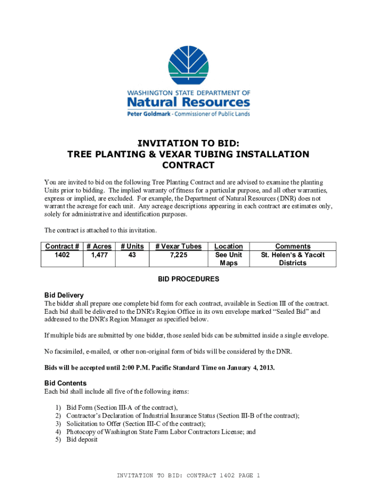 This document serves as an invitation to bid on a tree planting and vexar tubing installation contract issued by the Washington State Department of Natural Resources, outlining the terms, bid procedures,