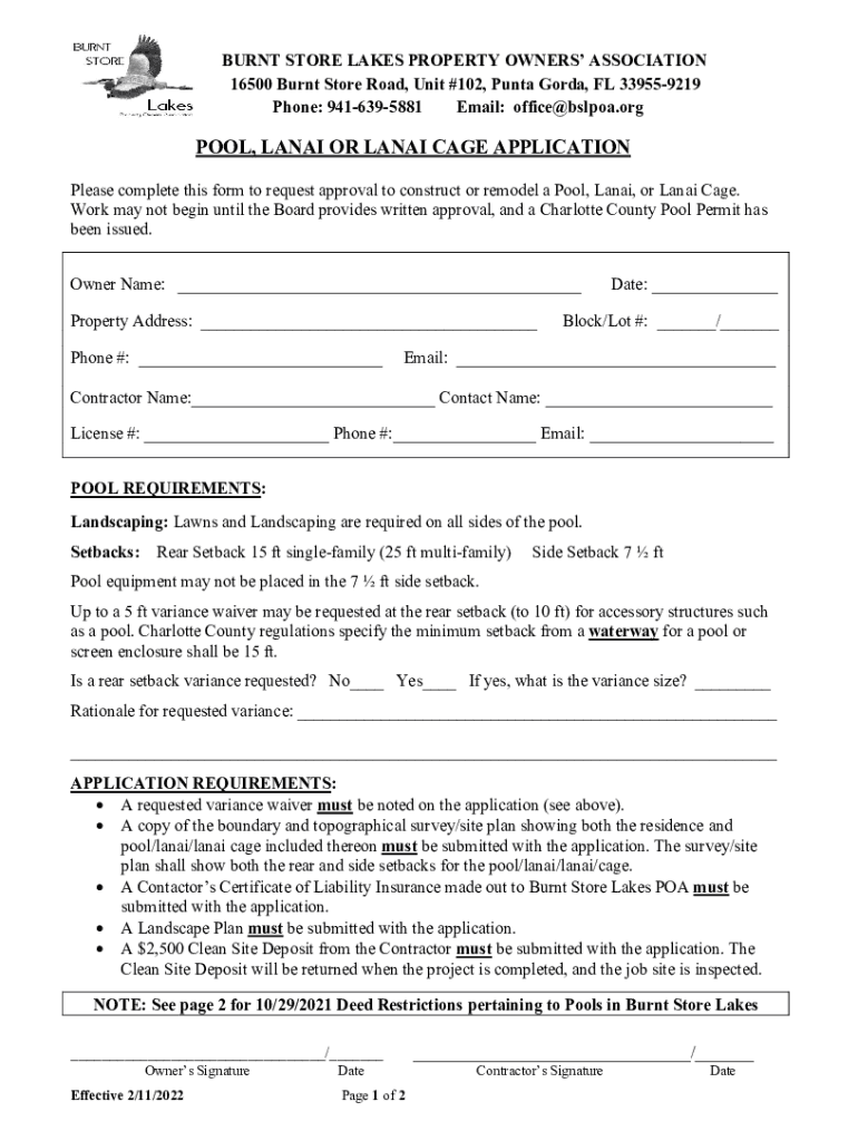 BURNT STORE LAKES PROPERTY OWNERS ASSOCIATION 16500 Burnt Store Road, Unit #102, Punta Gorda, FL 339559219 Phone: 9416395881 Email: office@bslpoa.orgPOOL, LANAI OR LANAI CAGE APPLICATION Please complete