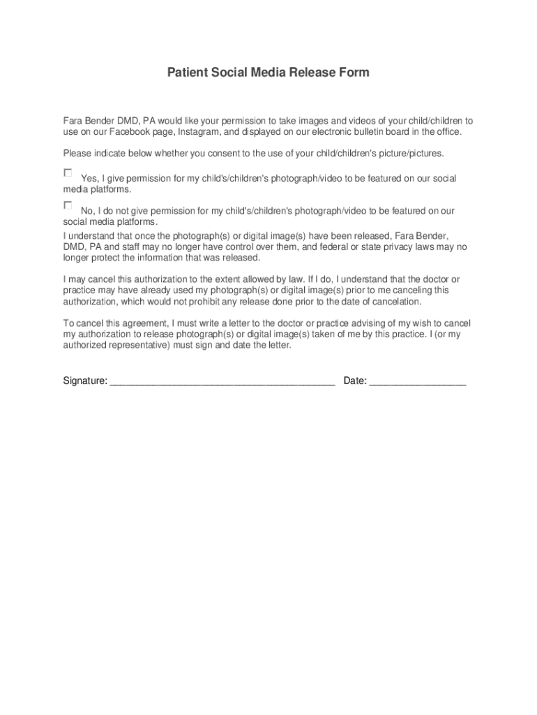 Patient Social Media Release Former Bender DMD, PA would like your permission to take images and videos of your child/children to use on our Facebook page, Instagram, and displayed on our electronic