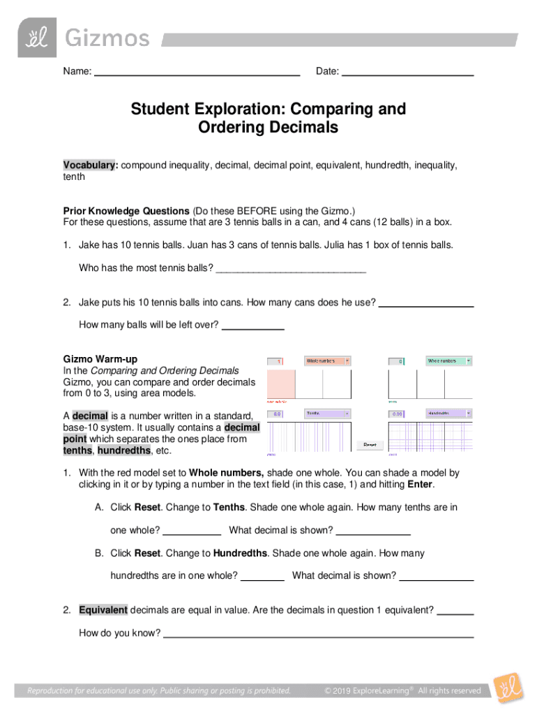 Name:Date:Student Exploration: Comparing and Ordering Decimals Vocabulary: compound inequality, decimal, decimal point, equivalent, hundredth, inequality, tenthPrior Knowledge Questions (Do these