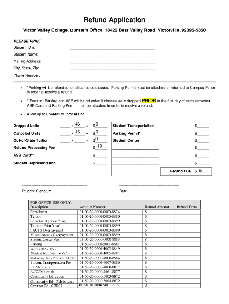 Refund Application Victor Valley College, Bursars Office, 18422 Bear Valley Road, Victorville, 923955850 PLEASE PRINT Student ID #:___Student Name:___Mailing Address:___City, State, Zip:___Phone Number:___*Parking