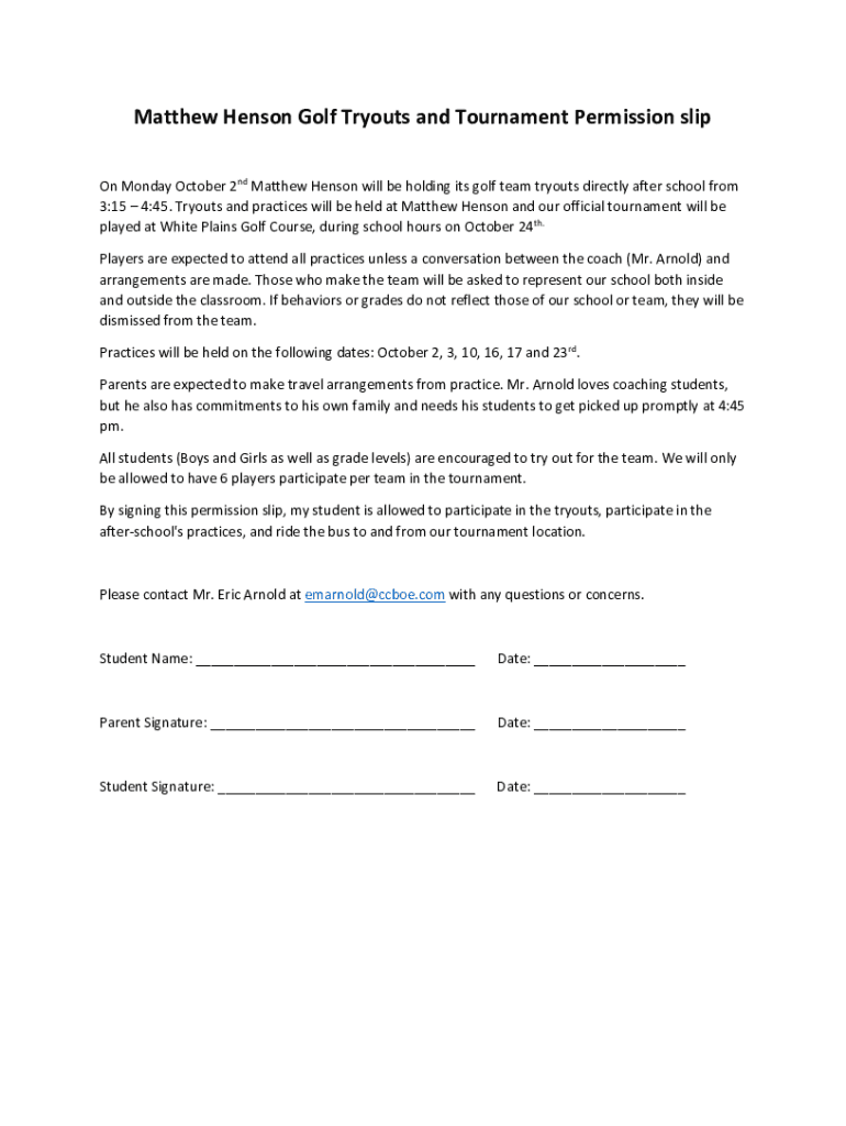 Matthew Henson Golf Tryouts and Tournament Permission slip On Monday, October 2nd Matthew Henson will be holding its golf team tryouts directly after school from 3:15 4:45. Tryouts and practices will