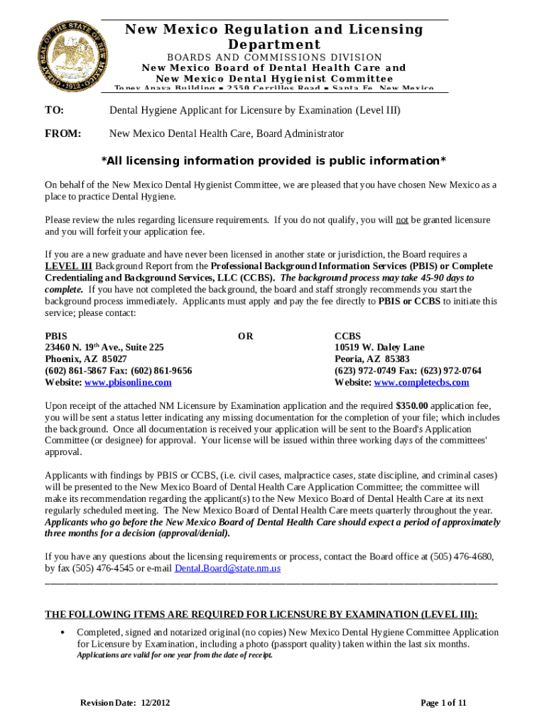 The dental hygiene application for licensure by examination ( ... is a document required to be submitted to the required address to provide some information. It has to be completed and signed, which can be done in hard copy, or via a particular solution such as PDFfiller. It helps to complete any PDF or Word document right in the web, customize it depending on your needs and put a legally-binding electronic signature. Right after completion, you can easily send the dental hygiene application for licensure by examination ( ... to the appropriate recipient, or multiple individuals via email or fax. The template is printable as well due to PDFfiller feature and options presented for printing out adjustment. Both in digital and physical appearance, your form should have a neat and professional outlook. You may also save it as the template to use it later, there's no need to create a new document from scratch. Just amend the ready template.