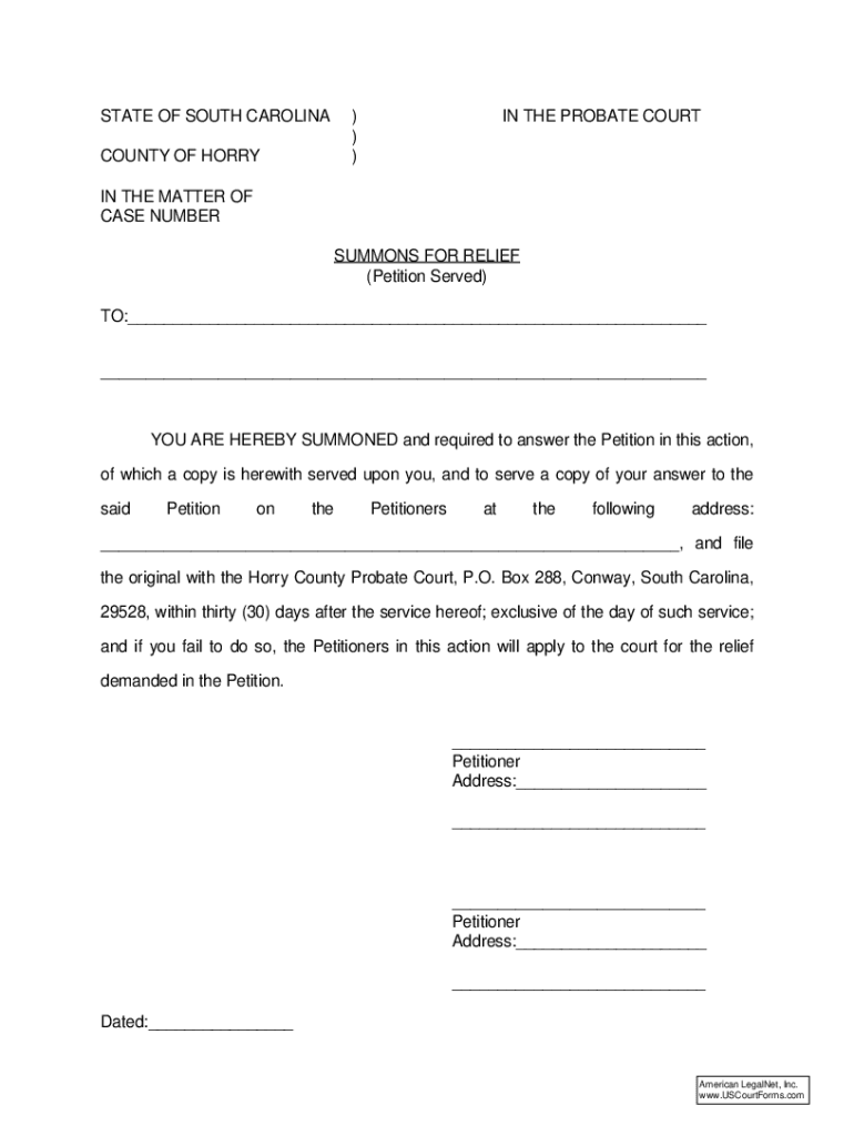 COURT COUNTY OF ...................................................... : :STATE OF SOUTH CAROLINA againstCOUNTY OF HORRYIndex No. Calendar No.:IN THE PROBATE COURT) Plaintiff(s) ) )JUDICIAL SUBPOENA: