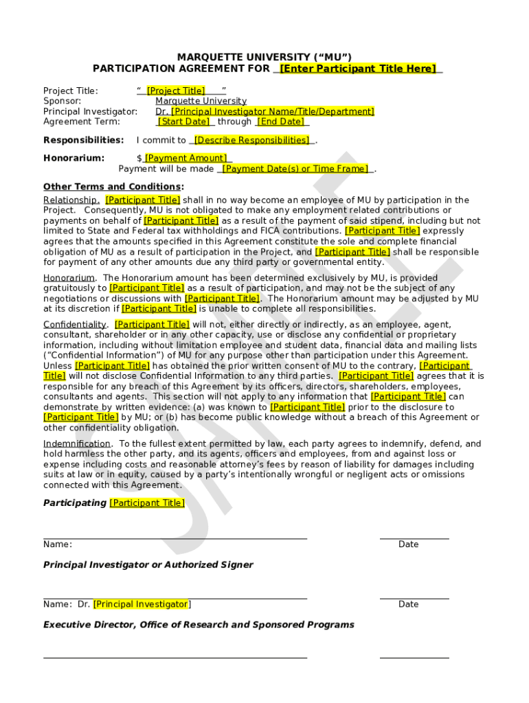 Before start filling out Participant Agreement Template Word template, remember to have prepared enough of information required. This is a important part, as long as errors can bring unwanted consequences beginning from re-submission of the whole word template and completing with missing deadlines and you might be charged a penalty fee. You need to be really observative when working with digits. At first glance, you might think of it as to be dead simple thing. Nevertheless, it is easy to make a mistake. Some use such lifehack as storing all data in another document or a record book and then attach it into document template. However, try to make all efforts and present accurate and solid data with your Participant Agreement Template .doc form, and check it twice during the filling out all necessary fields. If you find a mistake, you can easily make some more corrections when using PDFfiller editor without blowing deadlines.