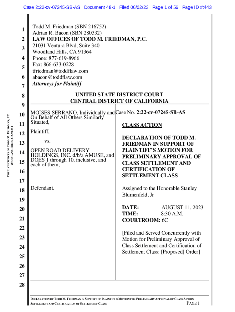 Case 2:22cv07245SBAS Document 481 Filed 06/02/23 Page 1 of 56 Page ID #:4431 2 3 4 5 6 7Todd M. Friedman (SBN 216752) Adrian R. Bacon (SBN 280332) LAW OFFICES OF TODD M. FRIEDMAN, P.C. 21031 Ventura