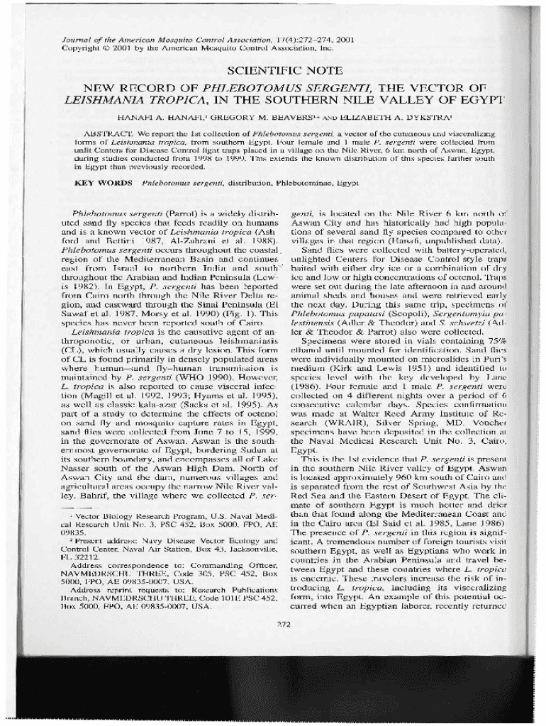 Journal of the American Mosquito Control Association, 17(4):272 274, 2001