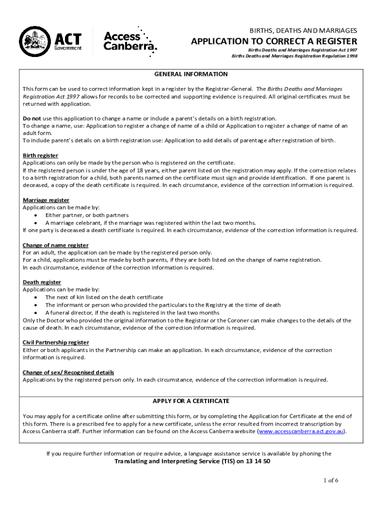 BIRTHS, DEATHS AND MARRIAGESAPPLICATION TO CORRECT A REGISTER Births Deaths and Marriages Registration Act 1997 Births Deaths and Marriages Registration Regulation 1998GENERAL INFORMATION This form
